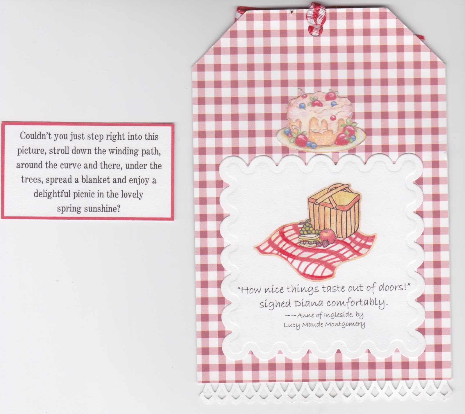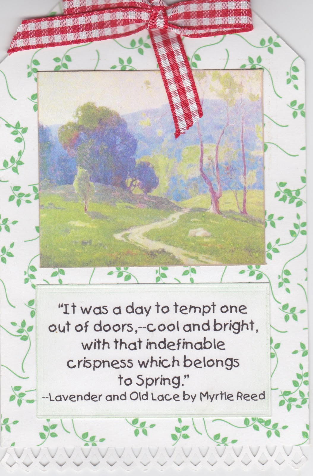 | This is a gift card holder I made for my local daughter's birthday. I got the idea from Gooseberry Patch. You pull the ribbon and out comes the gift card. We got her a Lowe's gift card to buy perennials with. |