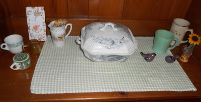 I decided that the ones I made were too bright yellow, and I didn't really like the green I had chosen for the leaves, either. (If only I had been able to salvage my homespun ones. But I couldn't.) So I picked a gold toile and a green calico for the ones I would be giving away. I still wasn't thrilled with these, but liked them better than the brighter colors, and I wanted to get them on their way.