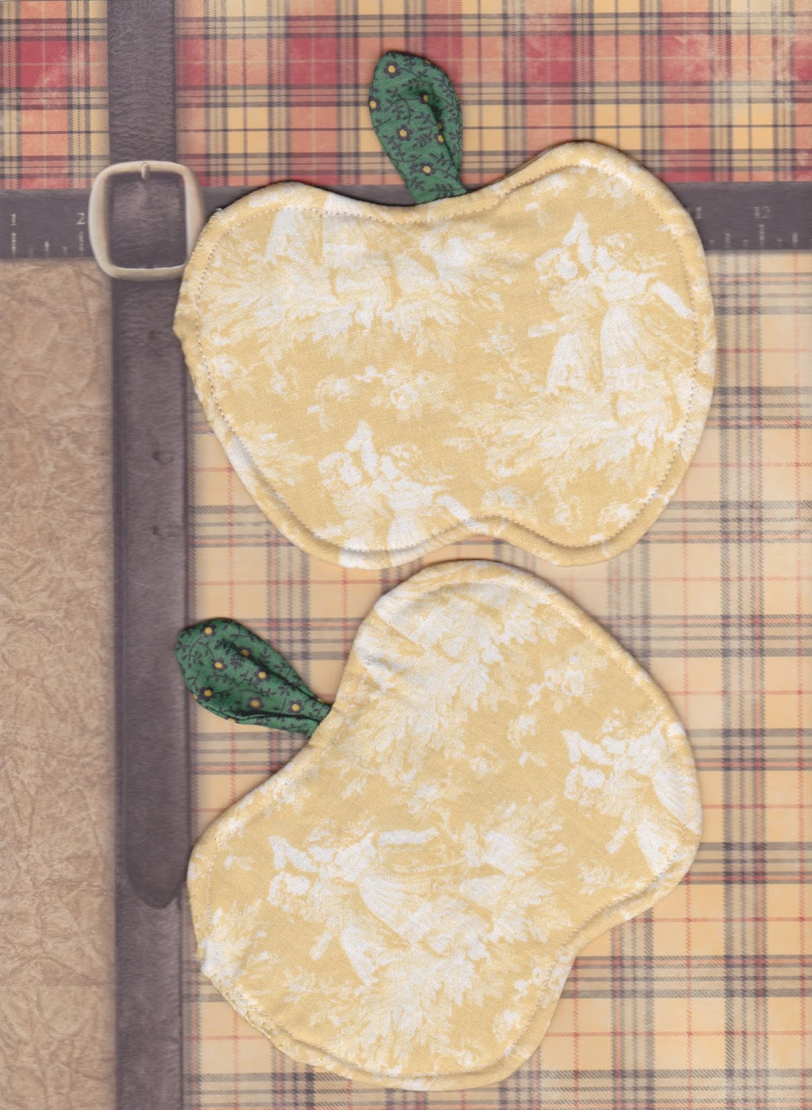 Many, many years ago now when we first met our friends Dick and Terry, they had some apple shaped fabric coasters in their home, which I really admired. I had seen similar ones in catalogs but hated to spend the money. I borrowed one of Terry's coasters, took it home, and figured out how to make one.