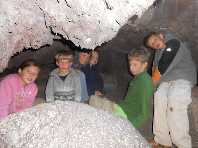 | Six of the cousins in a cave at Craters of the Moon |